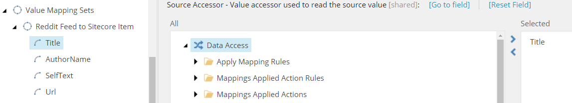 To bring those together we will use a value mapping set. This will make the connection from the Reddit feed field to the Sitecore field. In this example Title of the Value Accessor Set for the Reddit feed chosen.