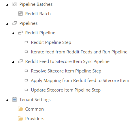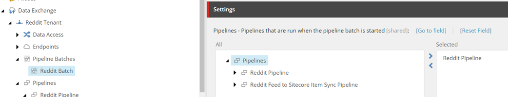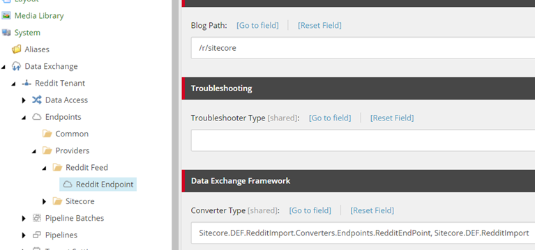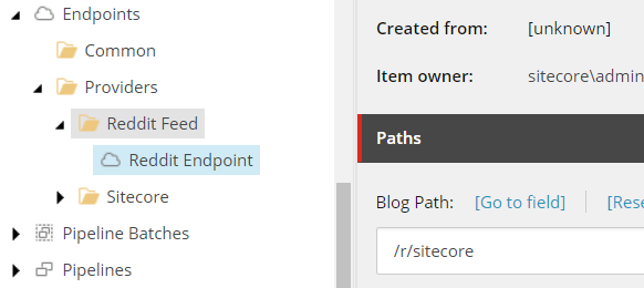 A collection of reddit feed blogs is then created. It will use fieldnames we defined earlier to match the Reddit feed fields to the fields defined for the new Reddit Sitecore item.