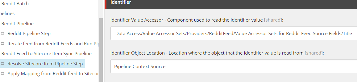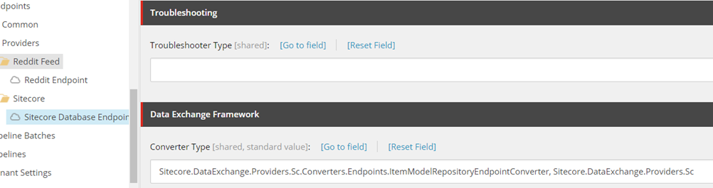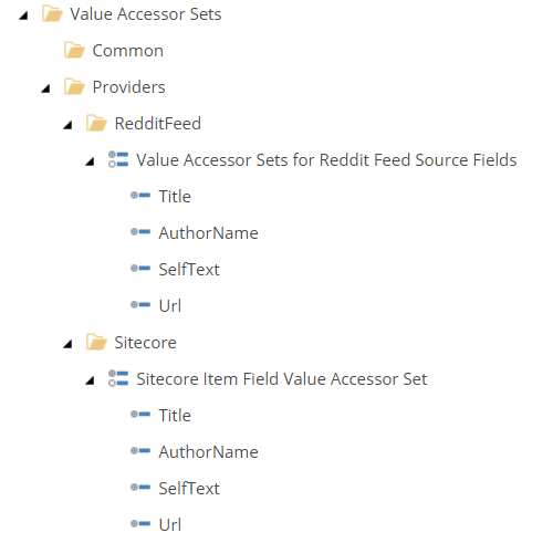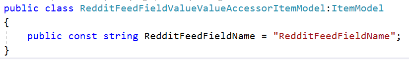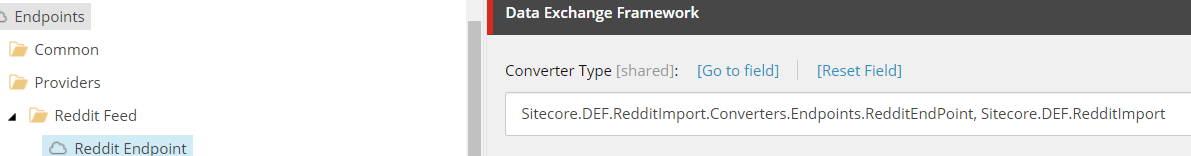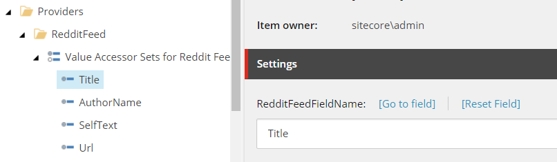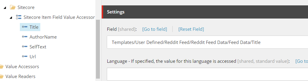 So how this corresponds to Sitecore is simple. A Value Accessor Set item is created and the items underneath it uses this template. In the RedditFeedFieldValueAccessorConverter class it is setup to get the value of that field using the combination of the template and the field name defined in the RedditFeedFieldValueValueAccesorItemModel. You will see how this is tied into other parts of the DEF process as we go along.