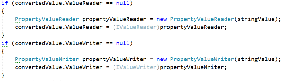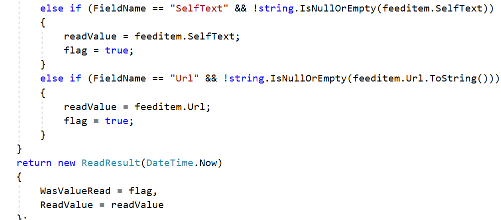 In the code you will notice a ValueReader and a ValueWriter are set. The ValueReader is used to read in the feed and match the fields for each Reddit blog item. The field definition is contained in the stringValue. The ValueWriter defines a new PropertyValueWriter class. That class is part of the DEF and used to convert the field values. (This code was changed in 2.1 versus previous versions so you might see this done differently if using an earlier version).