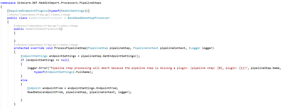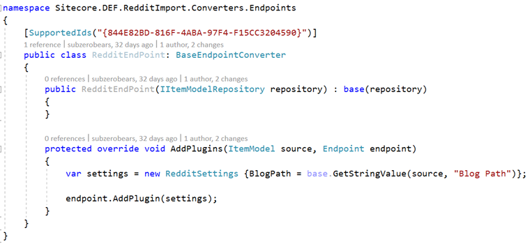 The next images shows the code for the processor. You will see that the Required EndpointPlugin is defined for RedditSettings.