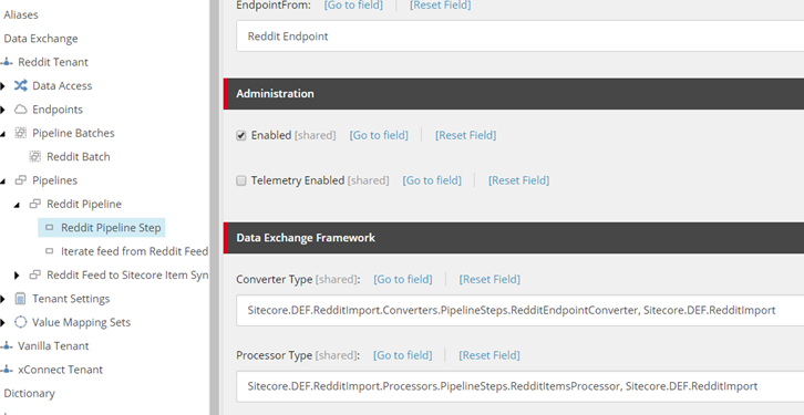 Looking in Sitecore you can see where the Converter Type points to the Endpoint Converter and the Processor Type which will get called and receive the end point information and do the Reddit Feed processing.