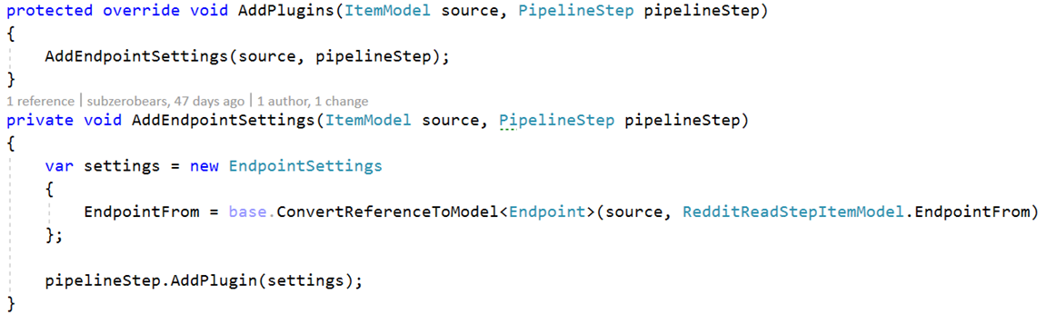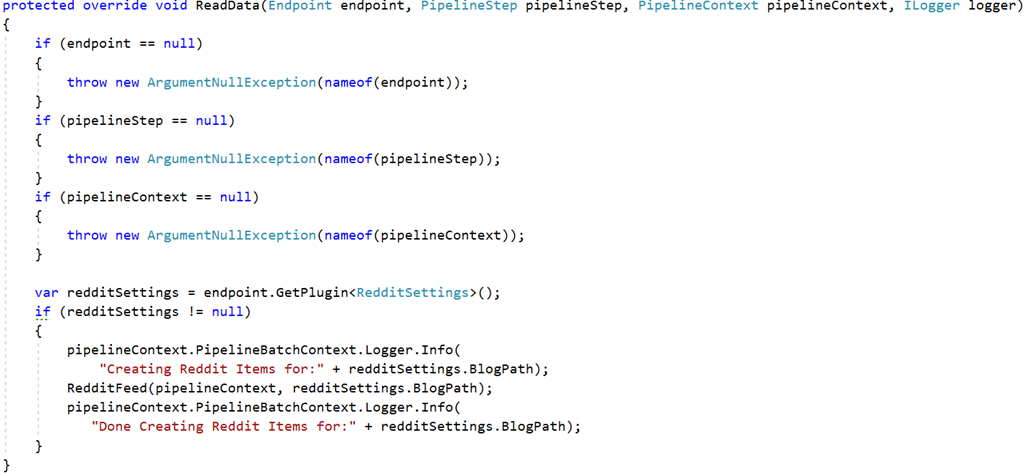 The Reddit End Point will have the information for the Blog Path in Reddit. The TemplateId defined points to the RedditEndPoint template. Settings are returned and added to the plugin. The plugin is required to be implemented by the pipeline converter and processor.