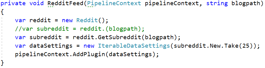 If you look at the method RedditFeed, what that does is create a new Reddit class using RedditSharp. It then uses the blogpath setting from the endpoint to retrieve the blog feed.